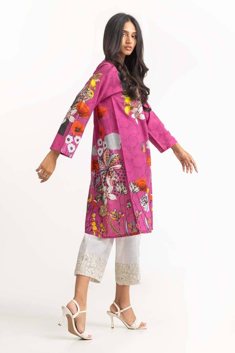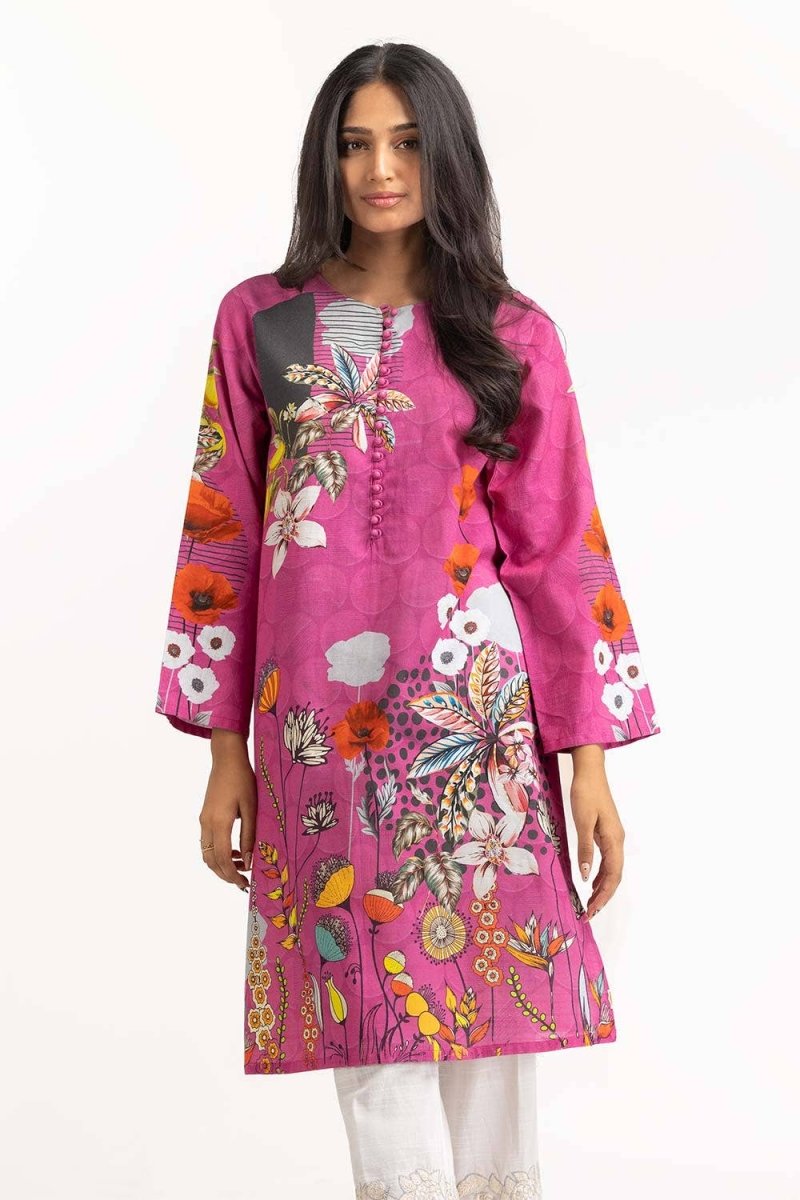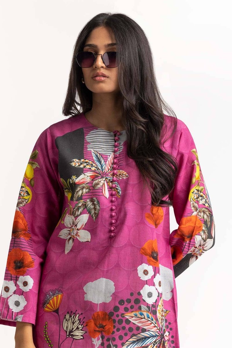 • Digital Floral Printed Khaddar shirt with closed side seams and looped buttons qued on neckline.