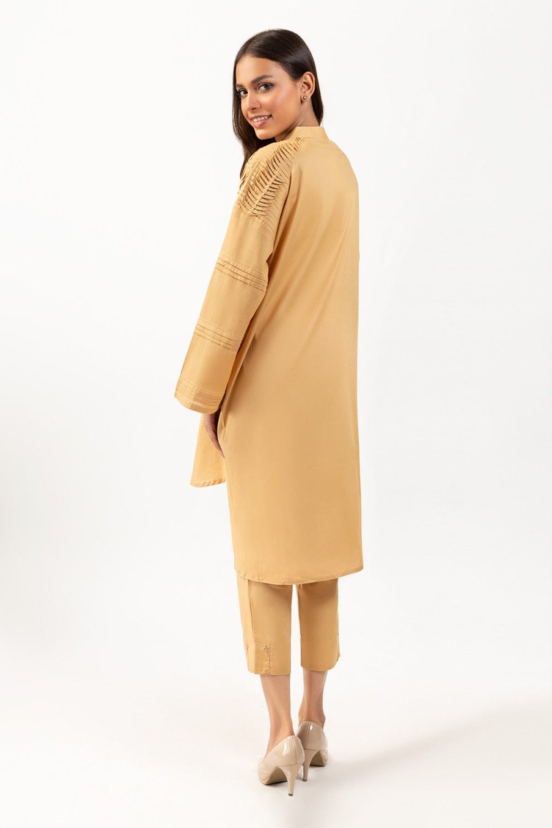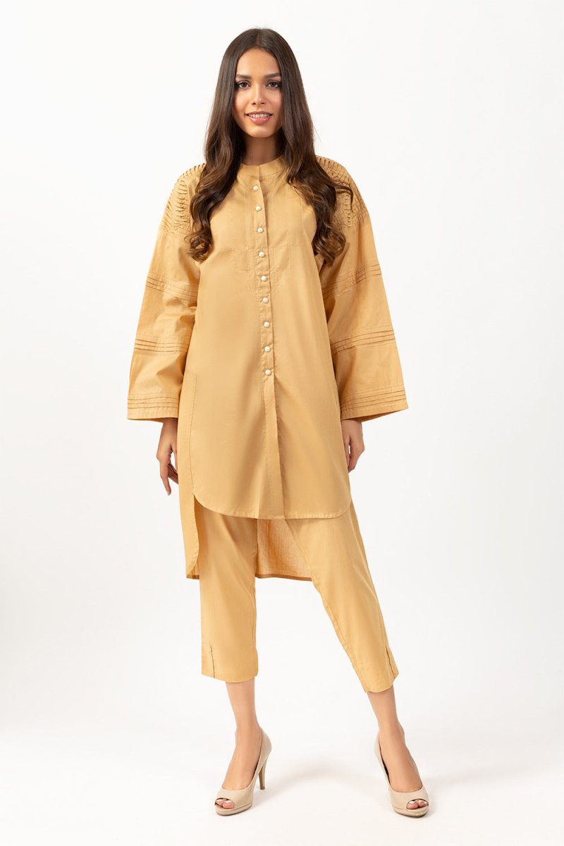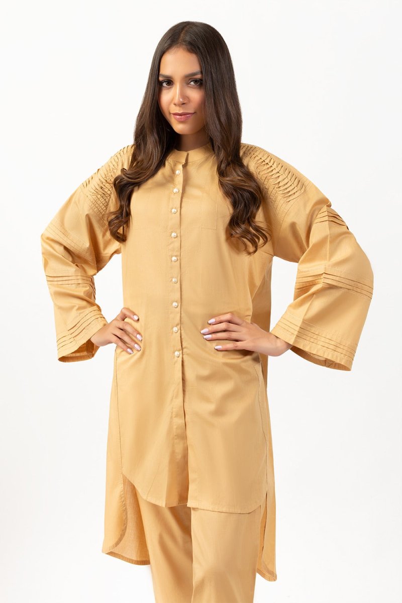 • Beige, cambric, pleated shirt with pearl buttons, hand-work and cambric trouser