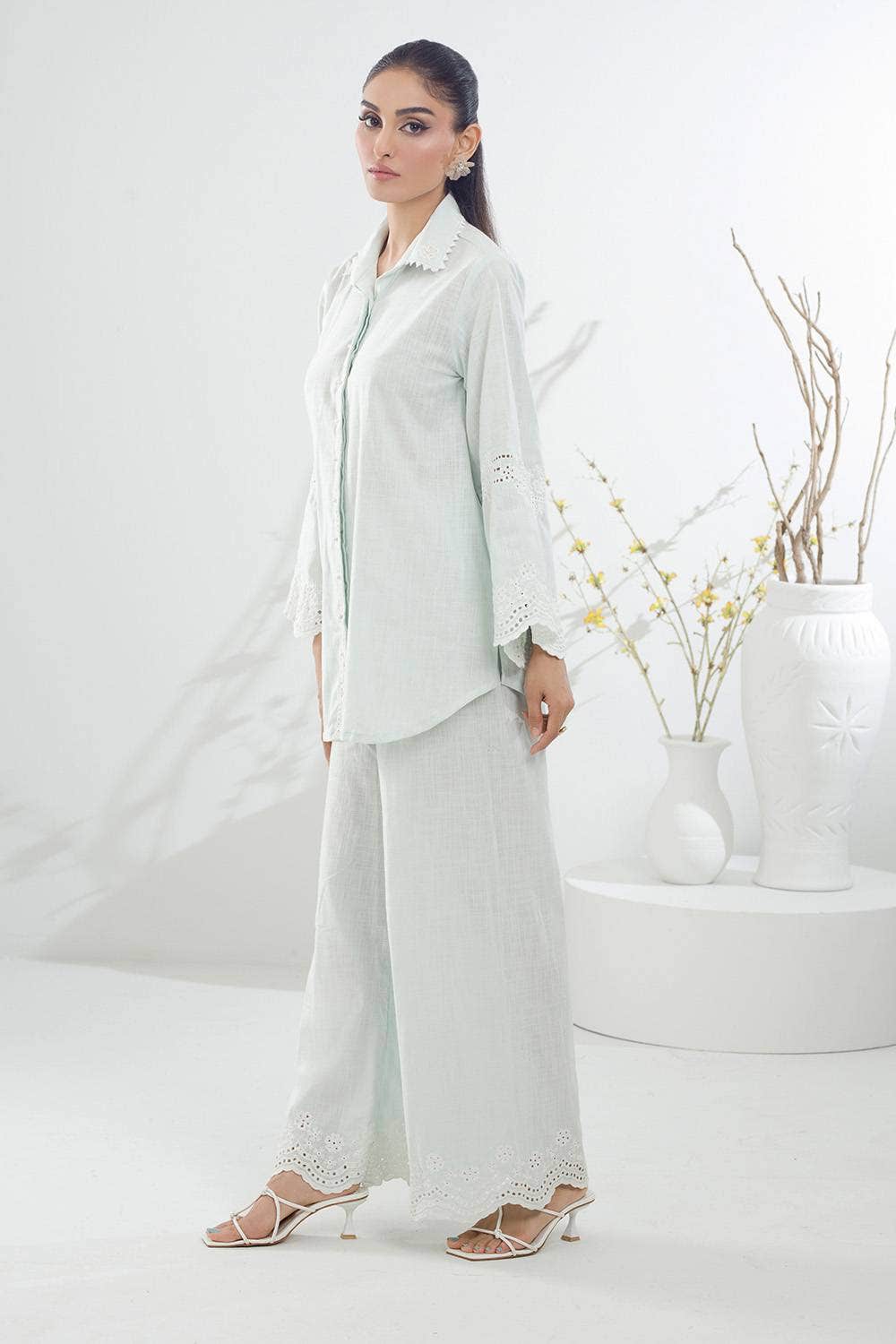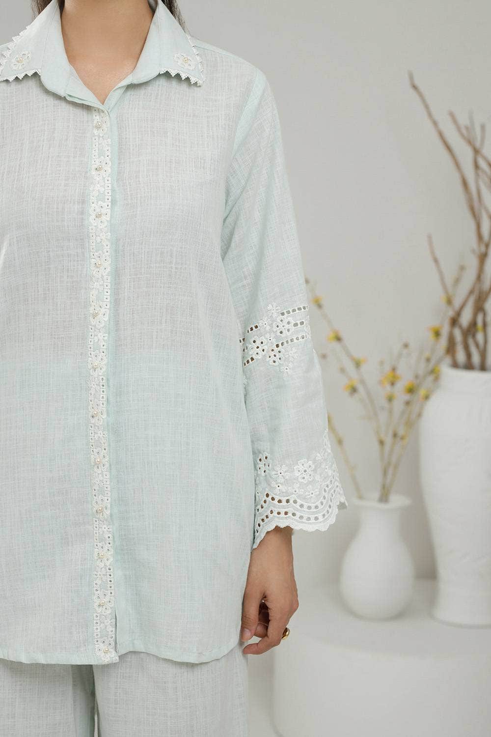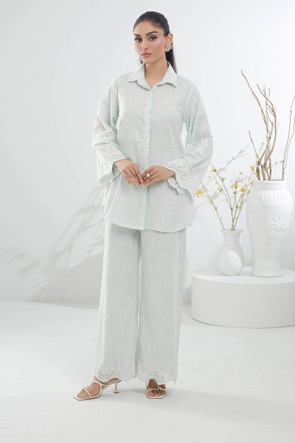 Ready to wear An ice blue Irish embroidered co-ord set, adorned with delicate embroidery that adds a touch of elegance. Perfect for both casual and semi-formal occasions, this chic set combines style and comfort effortlessly.