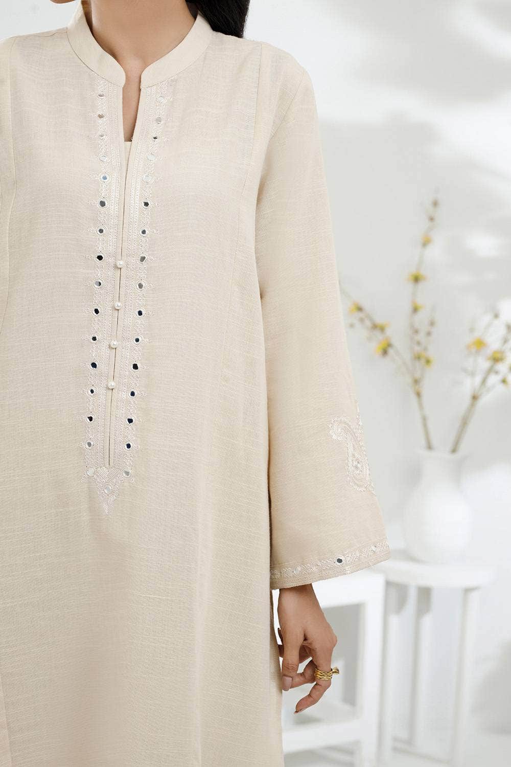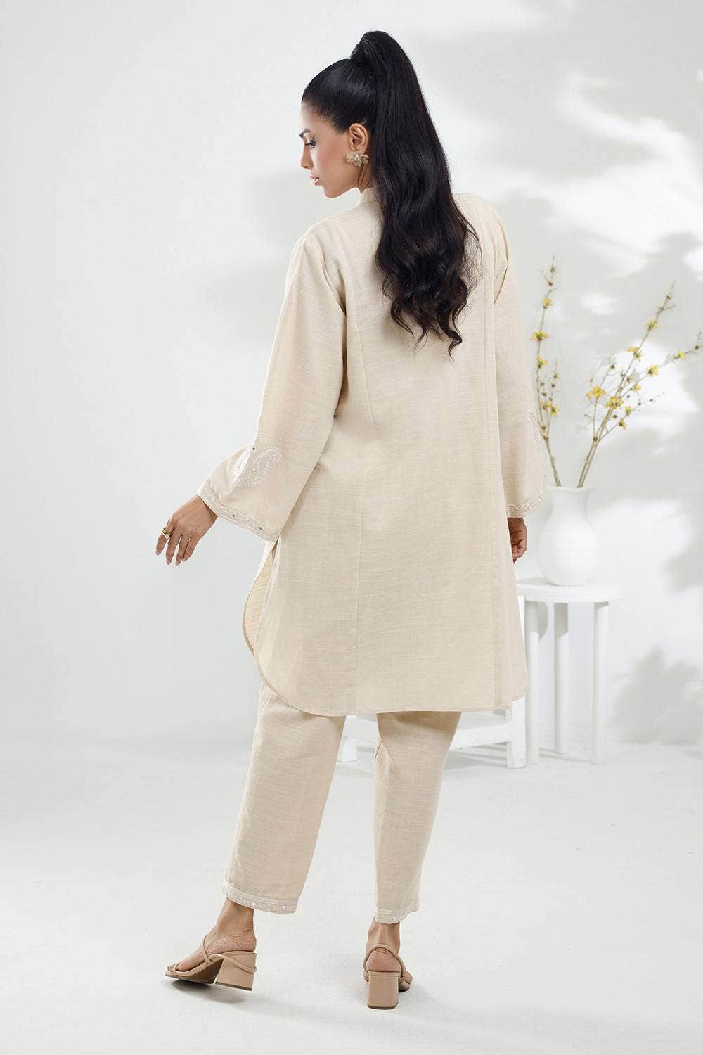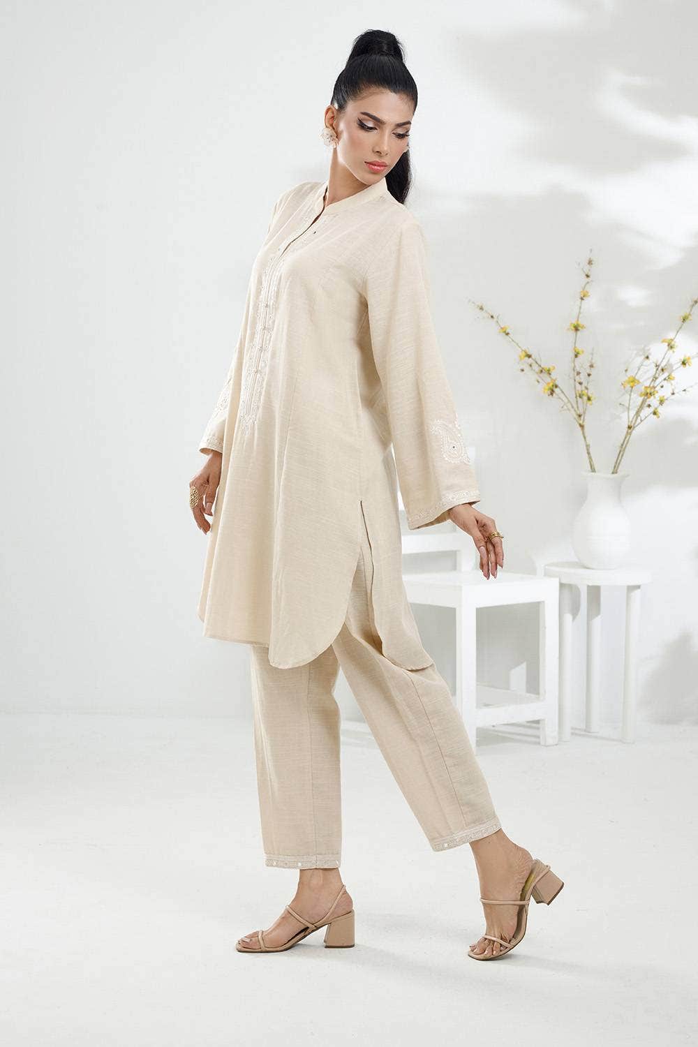 Ready to wear Embrace grace with this cream Co-Ord set with simple embroidery and buttoned neckline, paired with straight trousers for an understated, elegant appearance.