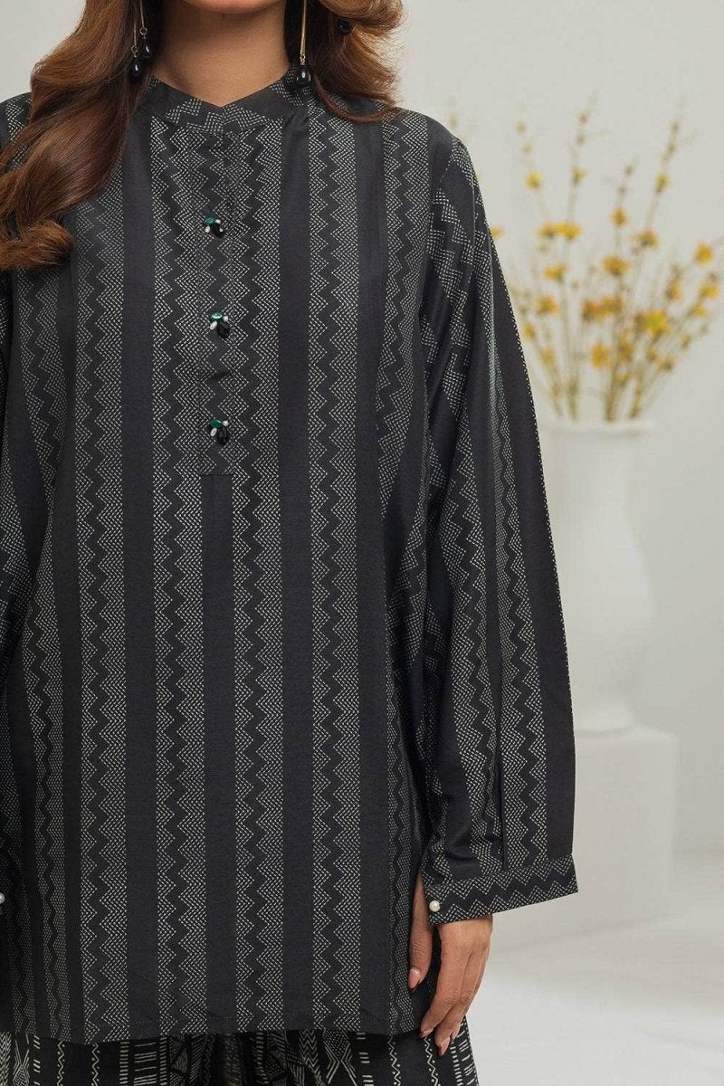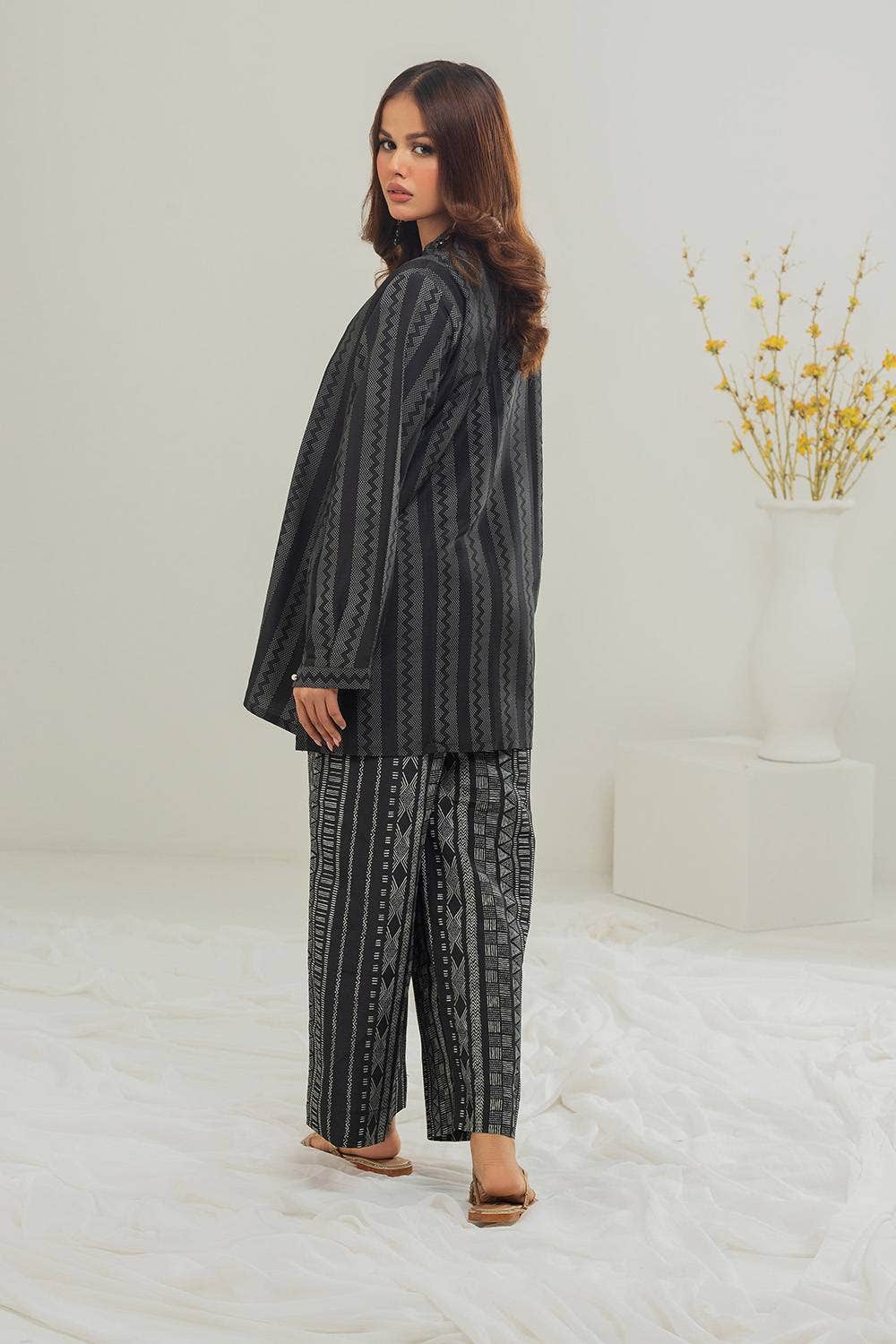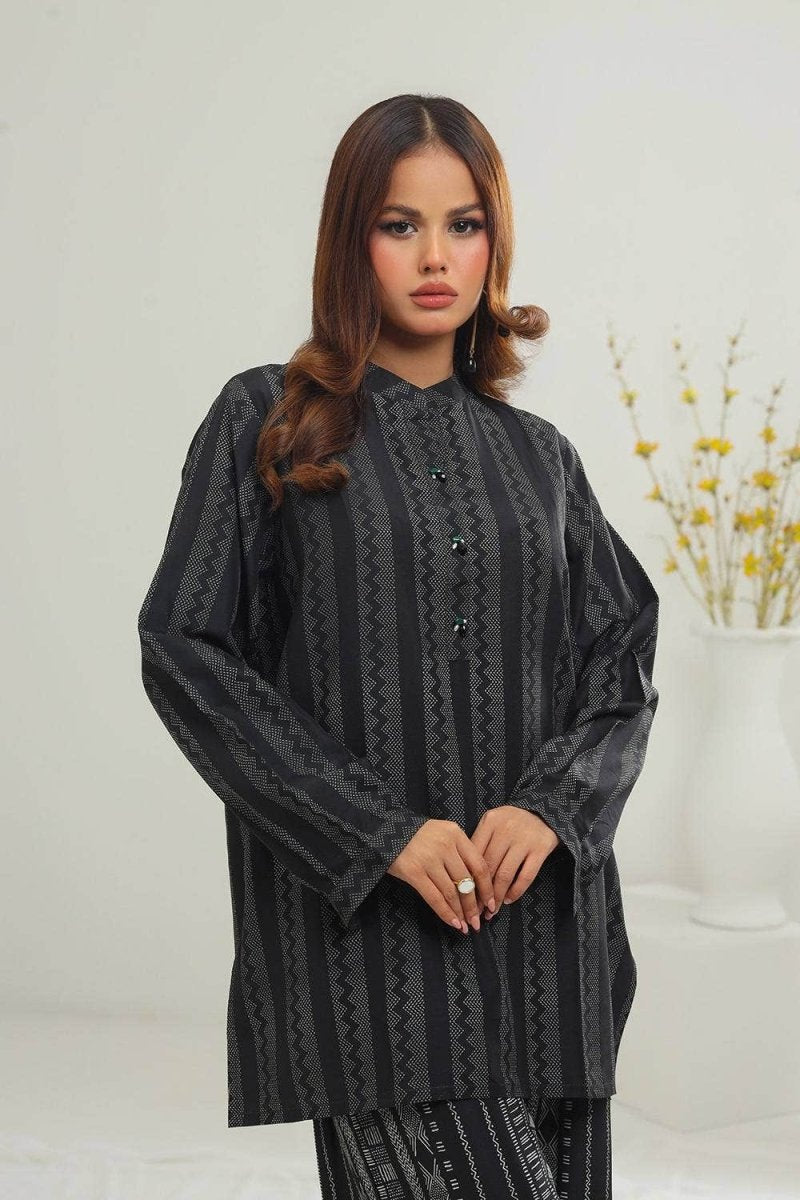 Ready to wear Stand out with this monochromatic 2PC co-ord set featuring a striking geometric patterns, a round neckline, and subtle ornaments on the placket. Paired with a contrasting trouser this set offers a striking look that's both elegant and versatile.