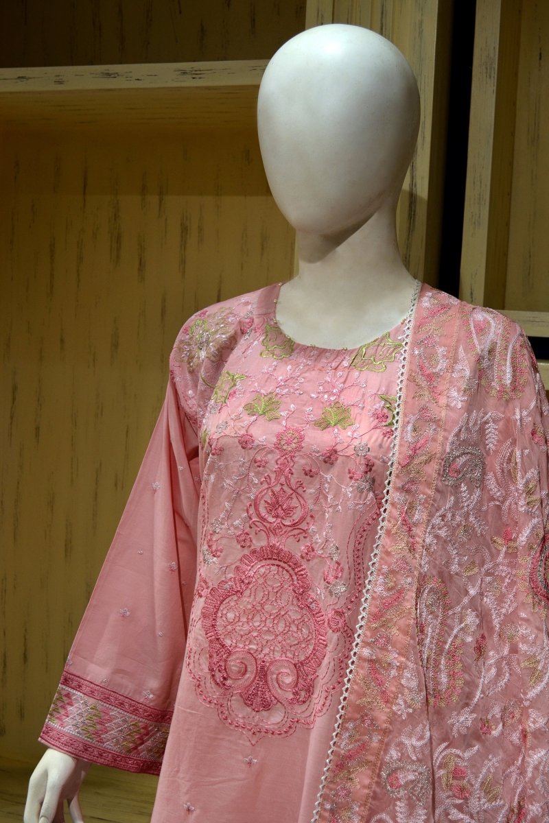 Embroidered Chiffon Dupatta with Croatia Lace. Sequin Embroidered front & sleeves with Embroidered Lace, Lacquer Printed back. Dyed Trouser.
