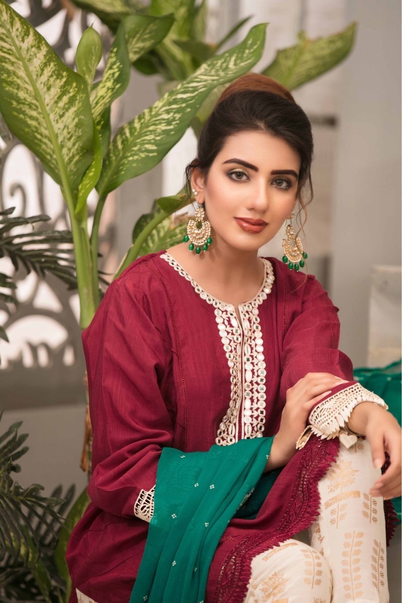 Grip silk shirt with mirror work and lace details. Block printed chiffon dupatta and grip silk trousers.