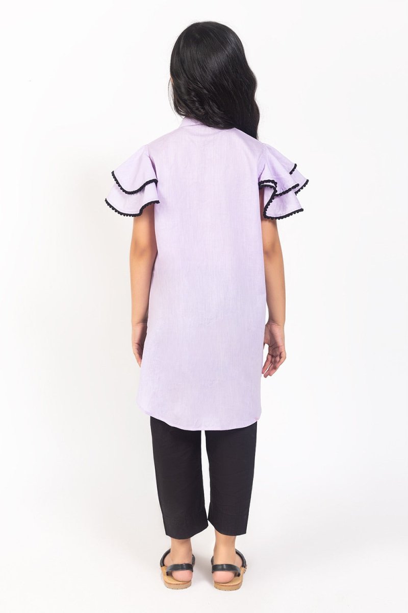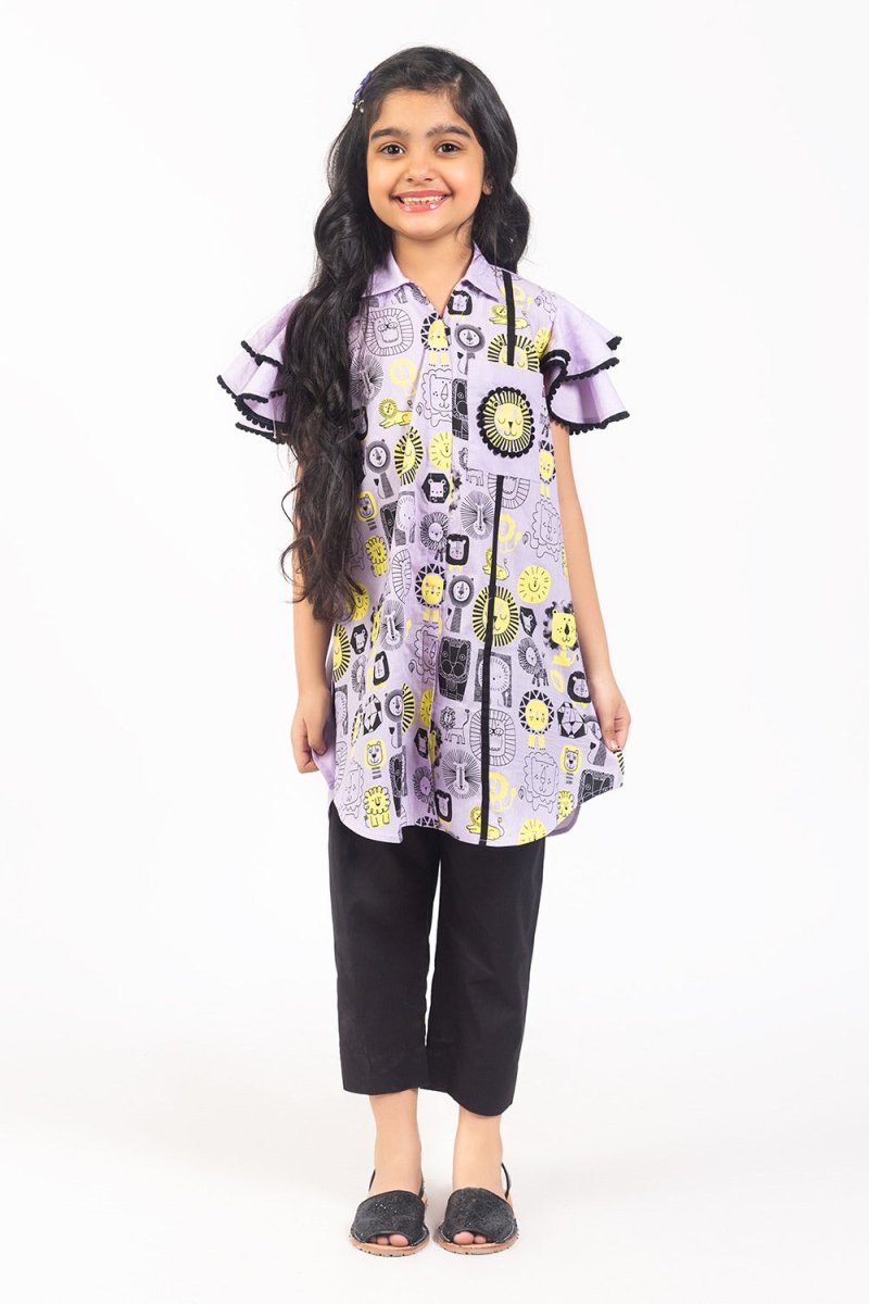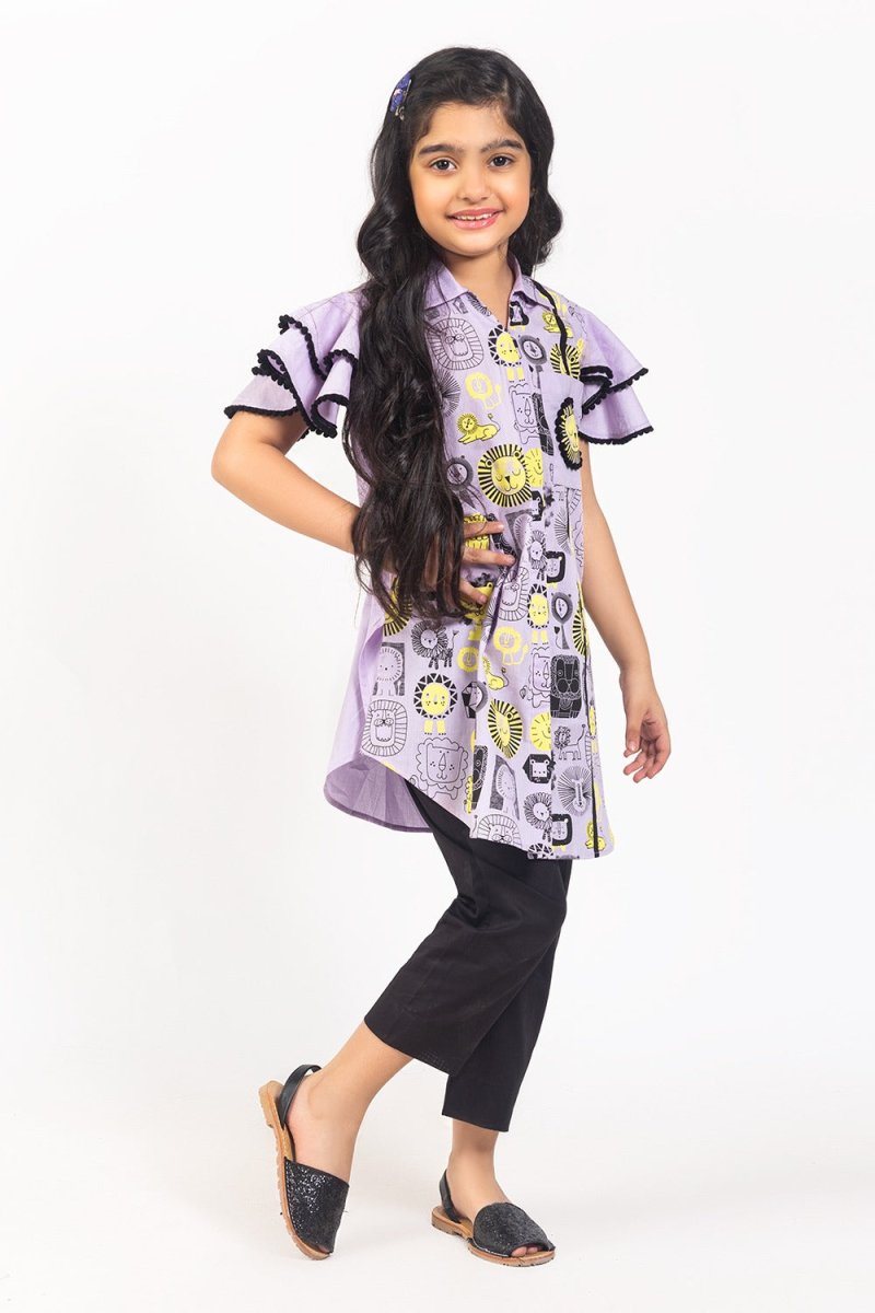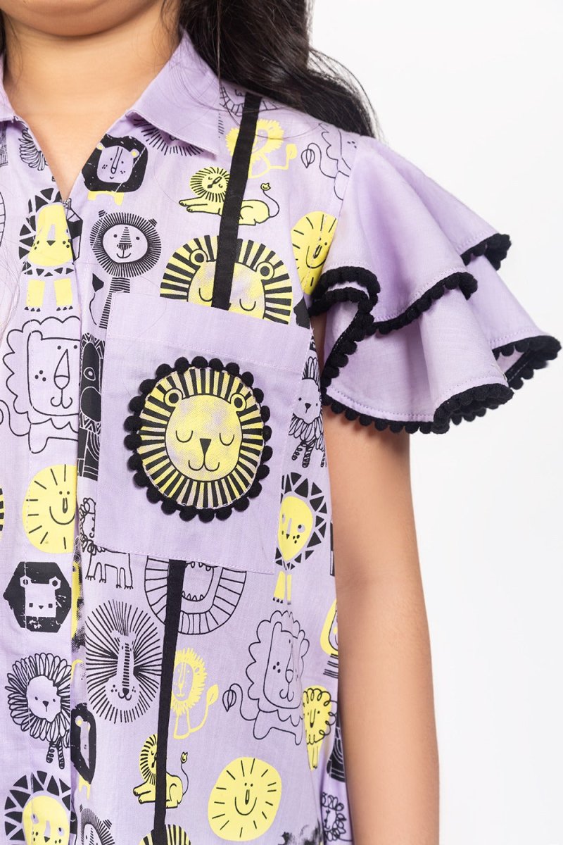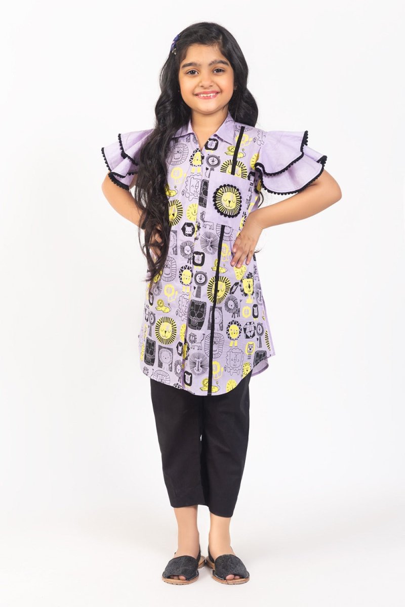 • A solid purple canvas layered with an animal-inspired screen print. The stylized collar and unique sleeve design will uplift the summer wardrobe for kids.