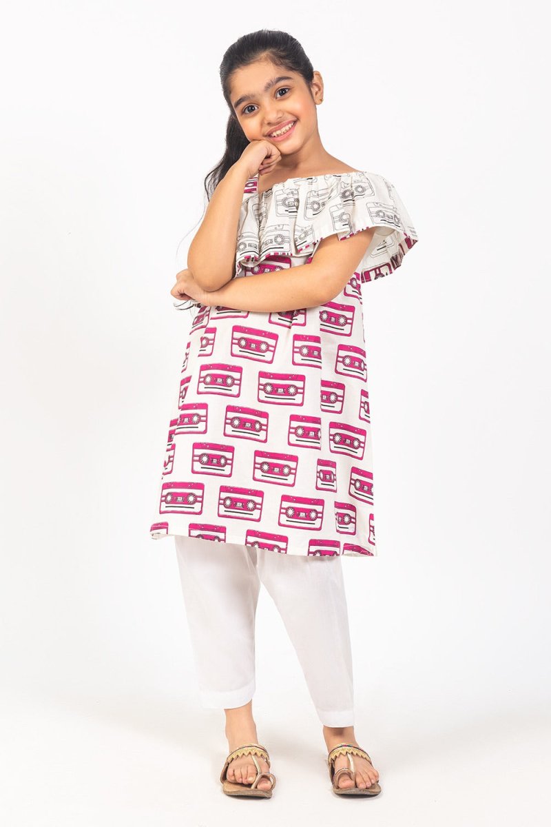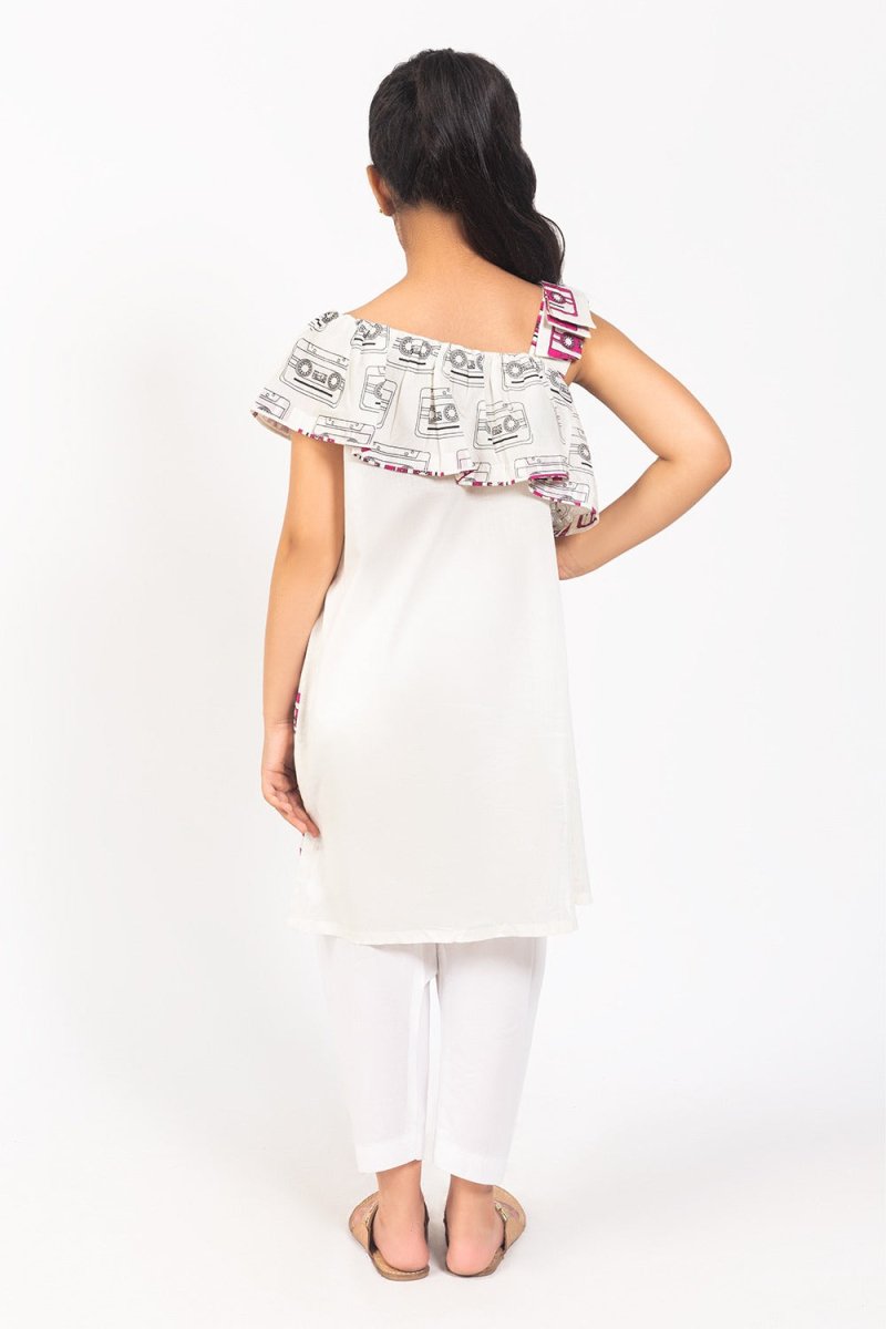 • An off-white cotton shirt screen printed with a contemporary cassette design coupled with a frilled neckline for a laid-back summer look.