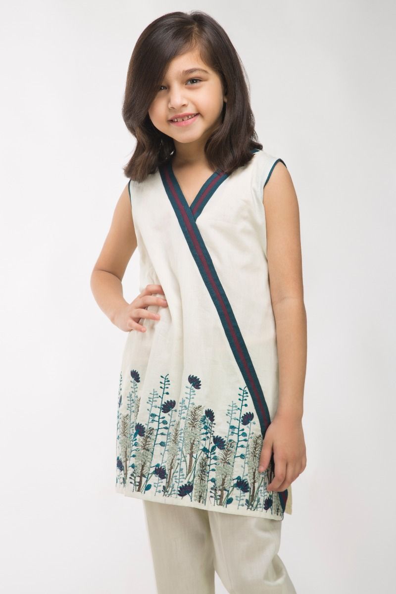 • Cream colored, sleeveless, embroidered lawn kurti and dyed, cambric trouser