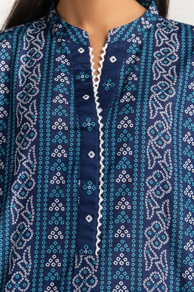 • Digitally printed lawn shirt featuring a ban collar with lace, straight hemline, and straight sleeves. Paired with a matching printed dupatta and a plain trouser.