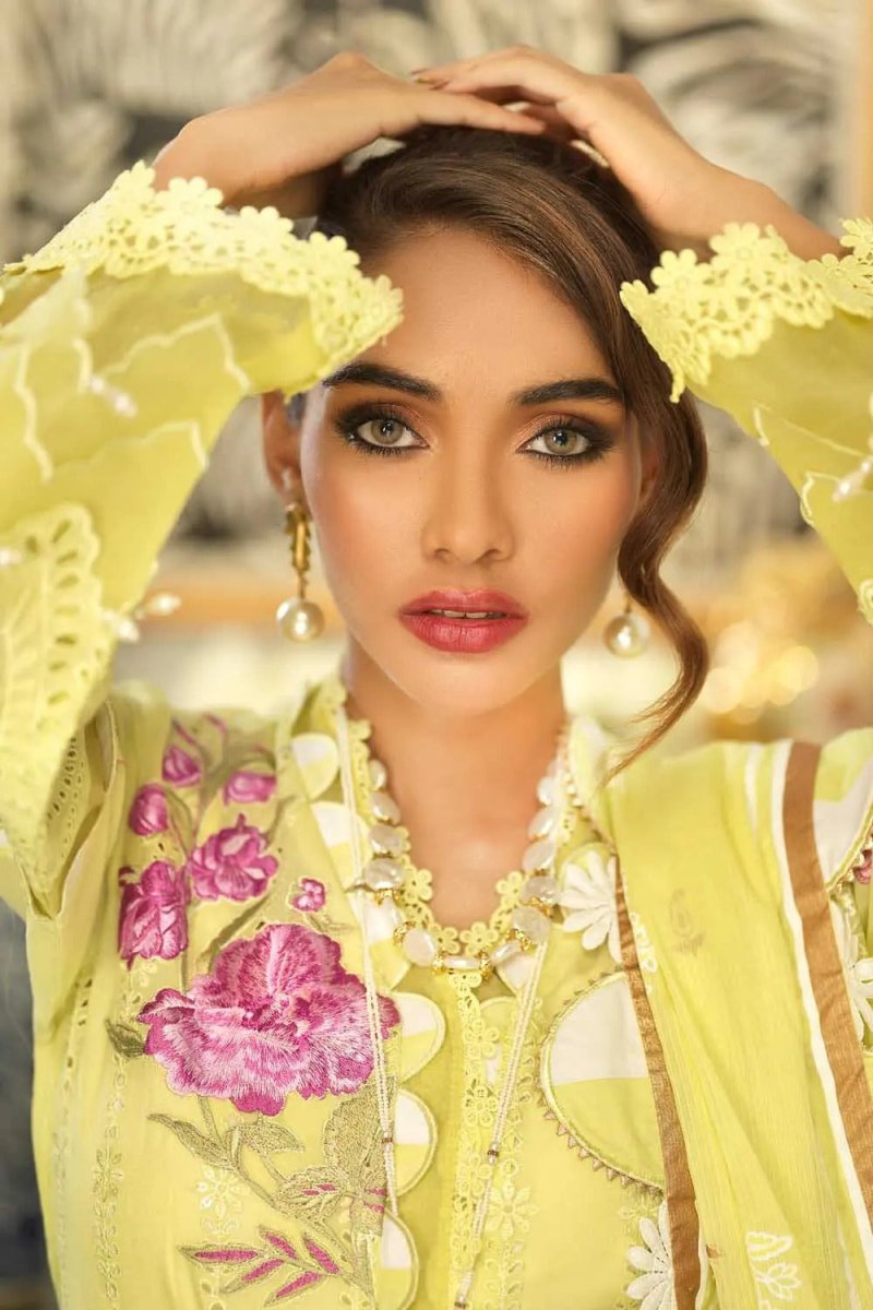 - Schiffli Embroidered Lawn Front & Sleeves with Dyed Lawn Back, Embroidered Bunches on Organza – 2.49 meters