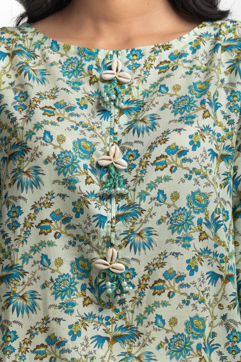 This trendy, floral printed shirt features a round neckline adorned with playful beaded tassels, makes it a comfortable and modern choice for everyday outdoors.