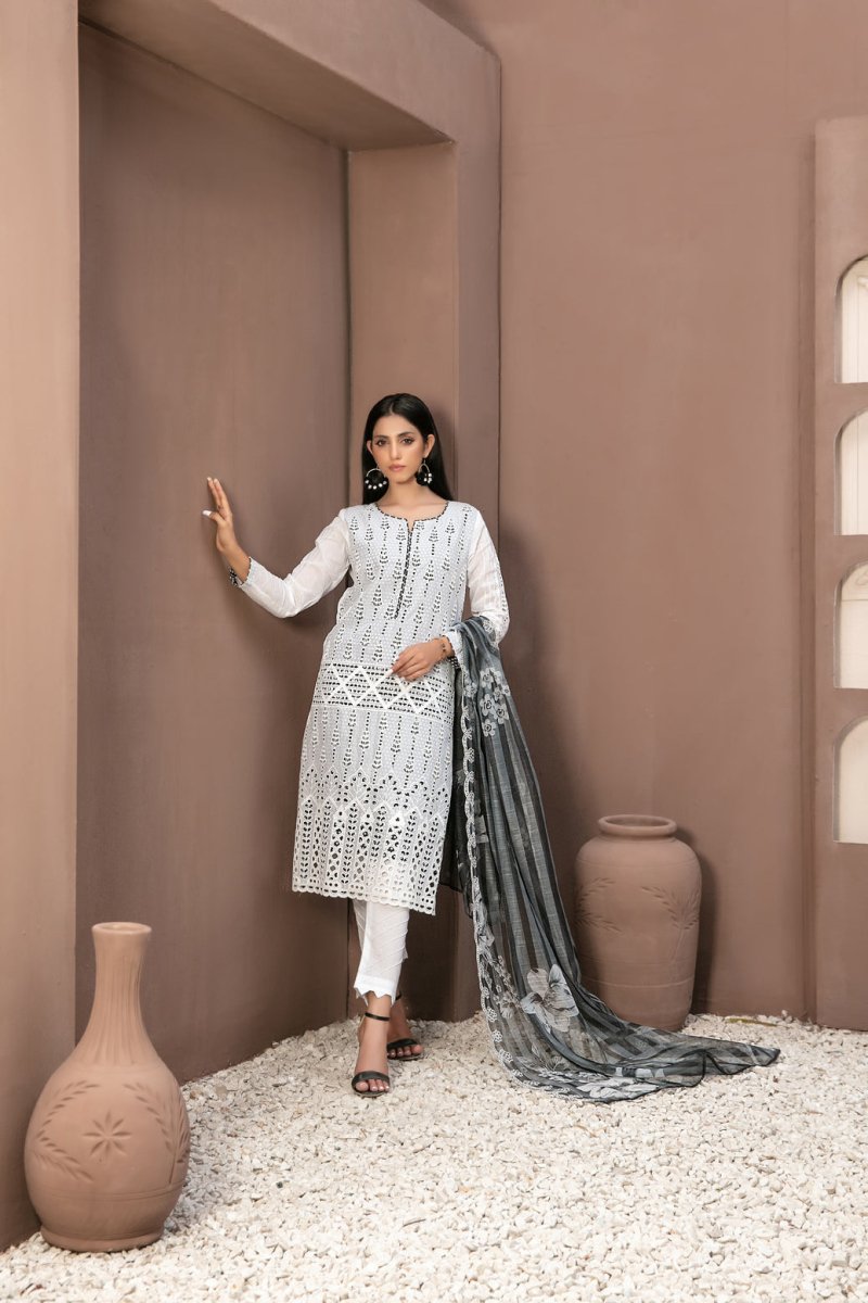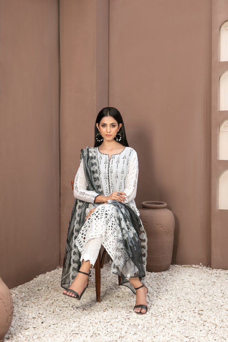 Tawakkal Fabrics 3 Piece Stitched Heavy Schiffli Embroidered Black/White Suit D-9711