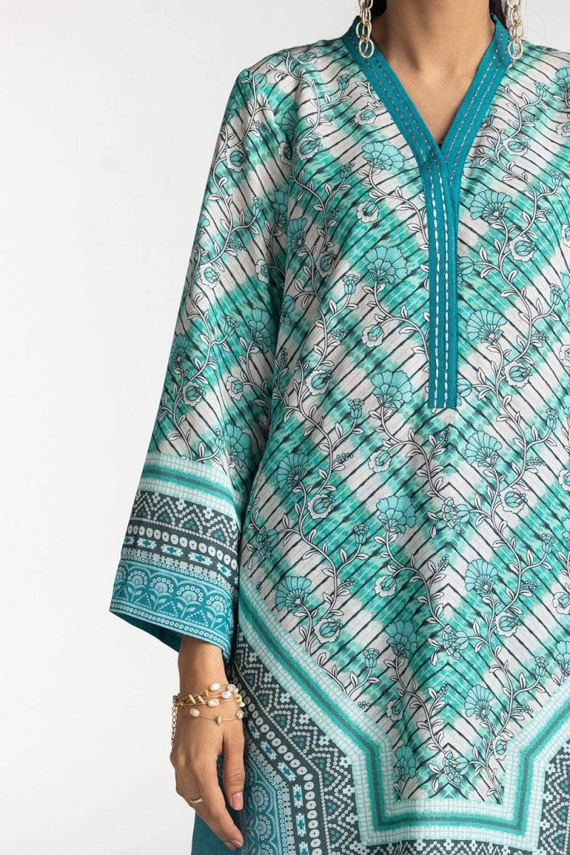 This outfit features a V-neck and long straight sleeves. The matching straight pants complement the printed dupatta, adding elegance to the comfortable and stylish look. Perfect for every day.