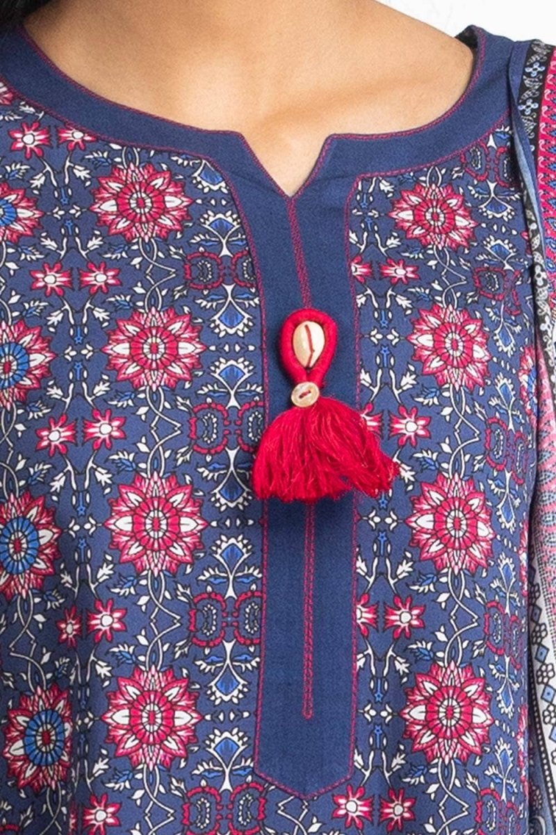 This striking 3PC blue outfit with a geometric design features vibrant red details and a matching dupatta. It’s perfect for adding a pop of color to your wardrobe with effortless style.