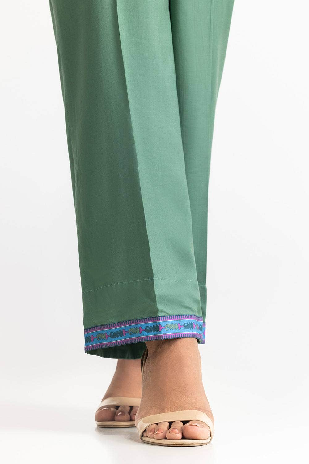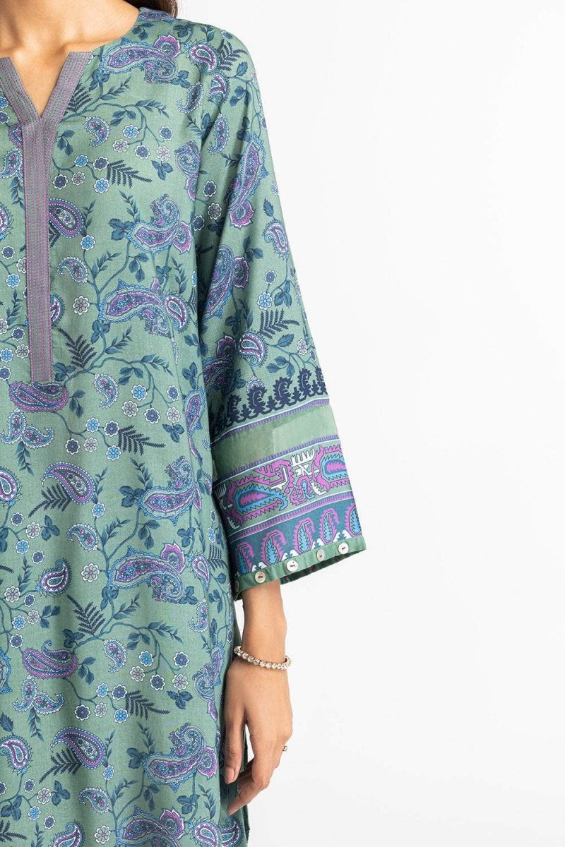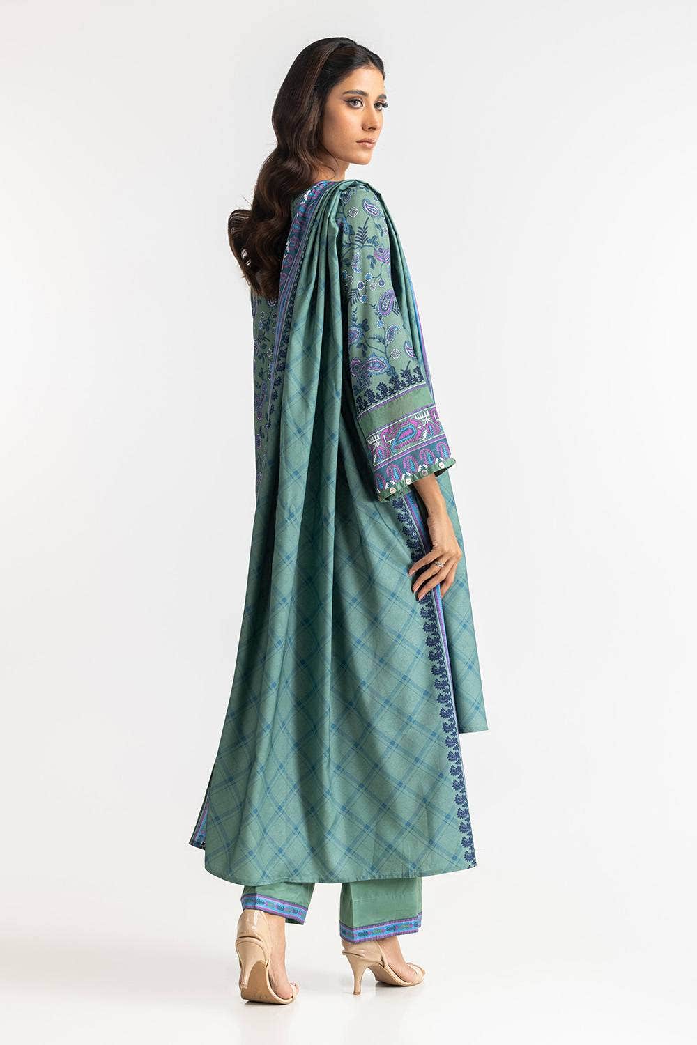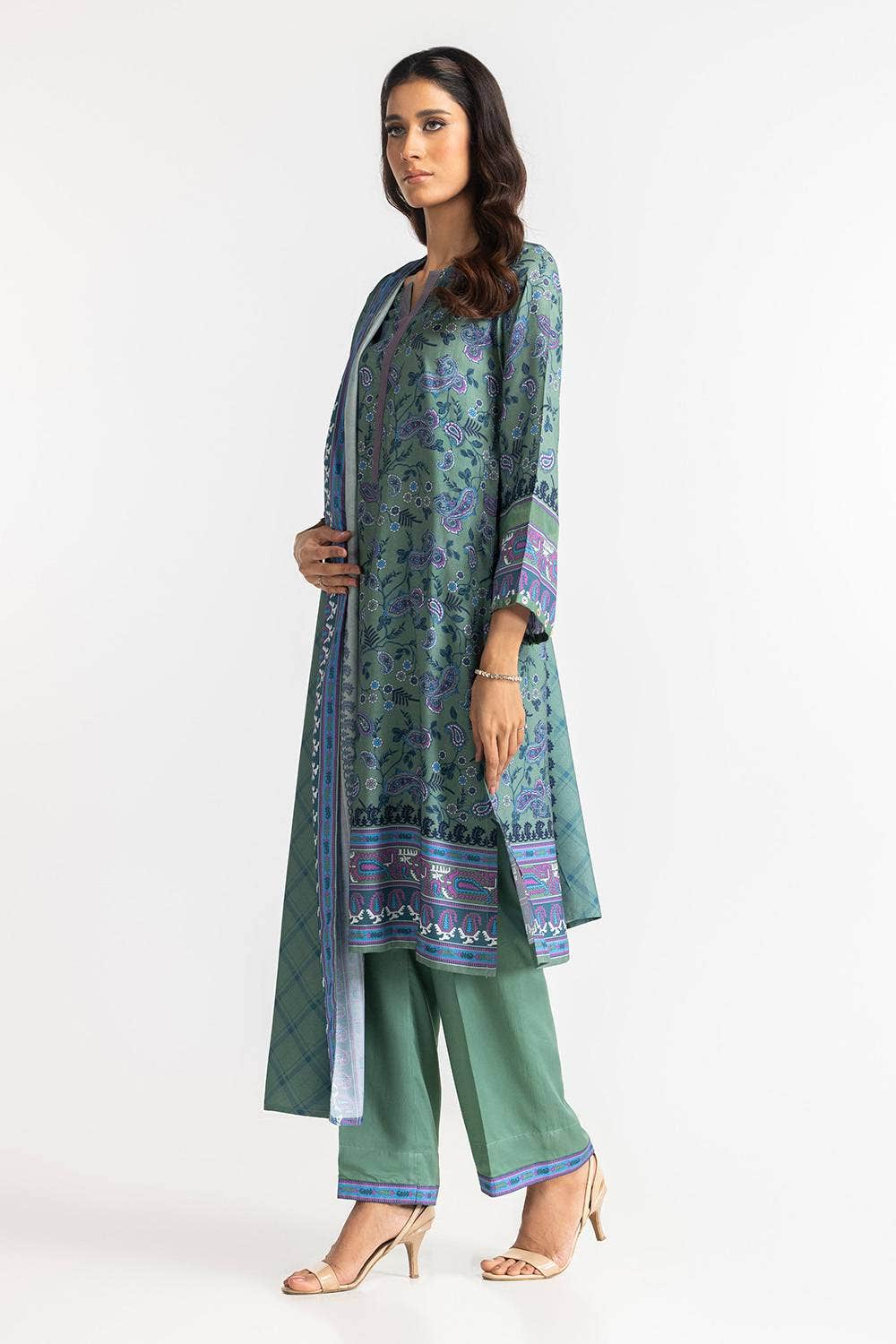 A timeless green 3PC outfit with intricate paisley patterns and a contrasting dupatta. The cool tones and fine detailing make this a graceful option for any occasion, blending style and comfort.