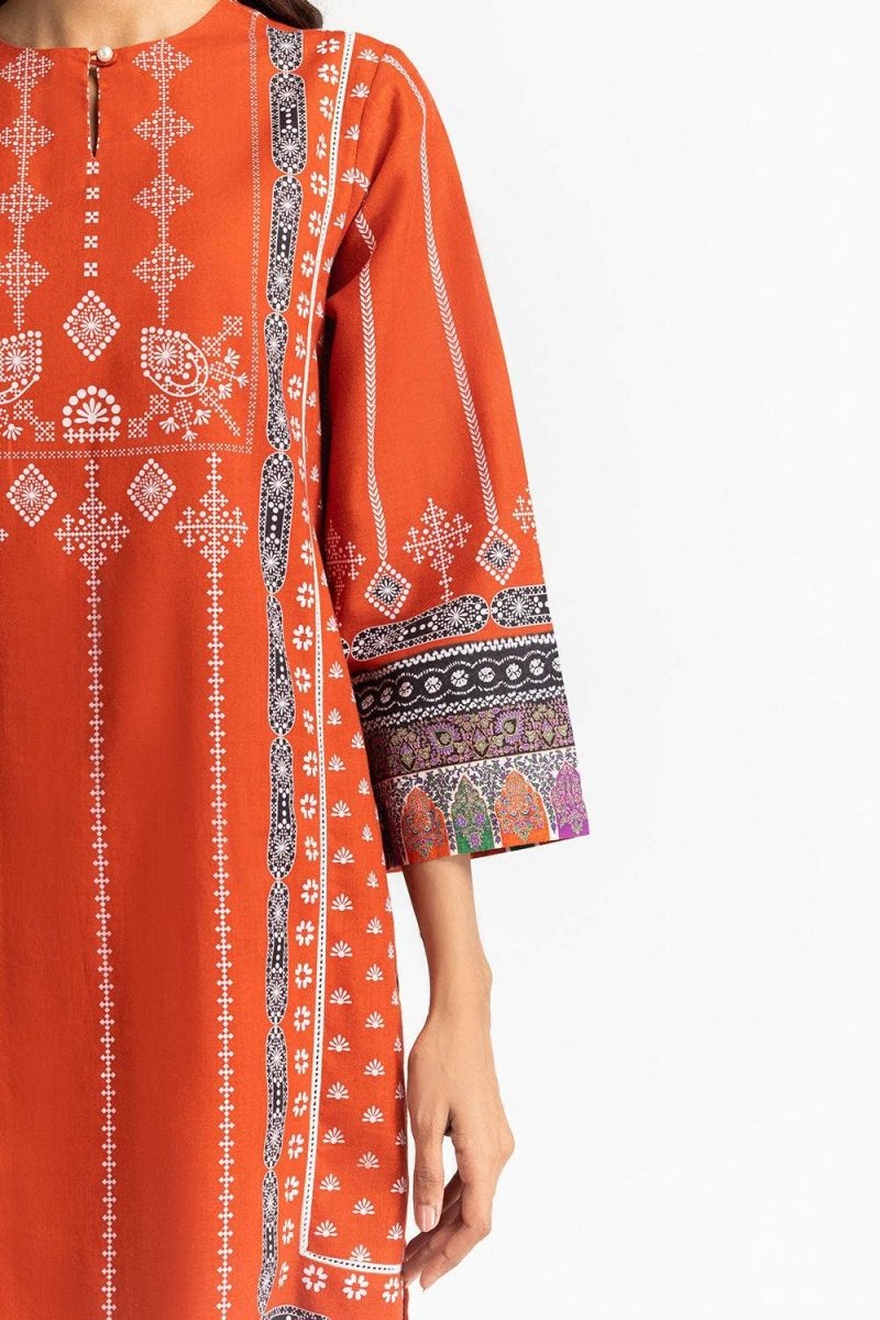 Ready to wear This vibrant 3PC orange outfit paired with a contrasting black printed dupatta brings modern style to tradition. The bold patterns and lively hues make it a perfect pick for festive days.